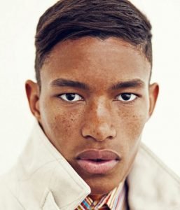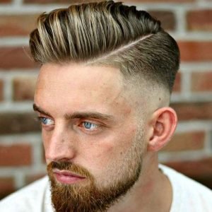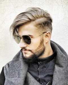 In a nice combination style, hair is long enough on top to be flipped over the head, creating a side falling bang that looks surfer inspired. Unlike a surfer style though, the back and sides are cut in a fairly close fade, providing interesting contrast between the longer carefree style and a short, tight-laced one.