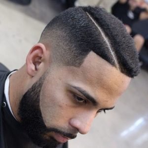 Not only does this cut features a precisely shaved part, but the lineup around the hairline is expertly sculpted while also fading into the skin, making it the perfect example of the style possibilities when you find a highly skilled barber.